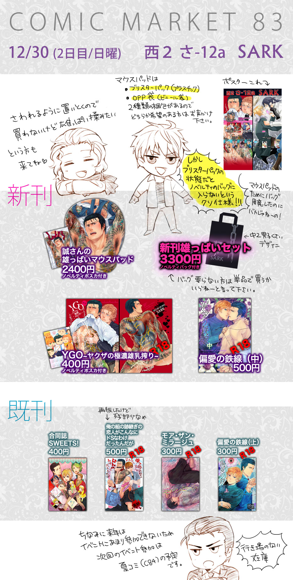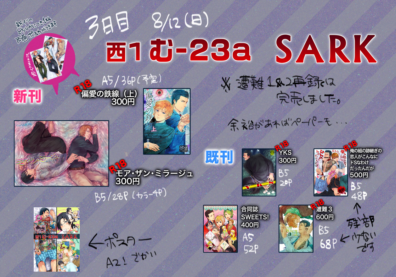 ハッ お久しぶりですみません。 TOPの方では告知しておりますが無事同人活動復活しております。 5月5日のヘタリアオンリーに仏独本出すよ~! 明日のスパコミには一般参加に行きます。 その次、6月30日のシティではいつもの創作BLで雅仁×誠の短めのエロ本の予定です。多分フェラ本。 あとYGOをいくらか再販していく予定。 ずっと放ったらかしていたミラージュのDL販売も開始します! 冊子版は手元にあとちょっとあるかんじです。 拍手レスはまた後ほど!すみません!ありがとうございます!! 遅くなりましたが冬コミありがとうございました!! 来て下さったのに新刊お渡しできなかった方すみません…! 毎回搬入数は少しずつ増やしてるんですがどうにも初動が読みきれずに… (雄っぱいマウスパッドはすげー残ってるよ\(^o^)/) 書店と自家通販にはまだまだあります~ あと、結構先になるのですが次回のイベント参加のときにも持って行きたいので 場合によっては再販しようかな~とも思ってます。 ちなみにドSフィスト本については今回で冊子版完売となります~!ありがとうございました! 以下拍手レスです ヒィィ!ずっとお返事返せずにすみません…! コメなし・レス不要の方もありがとうございます~!! あとペーパー作ればまぁ何とかといった感じです! うおーしかしここ最近リアルのほうが忙しくて色々アレです YKSのDL販売はもう少し先になるかも… 当日は私の新刊はないですが、ペーパーと帰っちゃうのポスターを出すので宜しければ見てって下さい~! 私は多分スペースでYGO(搾乳本)のネーム切ってるんじゃないかな…( ^ω^) 偏鉄上は書店にはいっぱいあるんですが手元にある分はちょっと少なめかな…? 続きから拍手レスです レス不要の方もありがとうございます~!!! ギリギリですみません~拍手レスと詳細は明日にでも… 取り敢えず持ち込み予定は ミラージュと偏鉄上とドSの再版とペーパーになります 帰っちゃうのポスターをできたら描く…! お久しぶりです! 日々のナニはツイッタしてるのでイベントないと本当にこっち書くことない…! 庭の情報もOFFに載っけておきました~ 新刊は…まぁ無理ですorz 偏鉄の中巻はいま丁度下描きが全て終わった段階です。全64P! 庭には夏コミの新刊二種とドS本をいくらか再版して(オンデマンドですが)持っていく予定です。 偏鉄の方は書店にはいっぱい在庫あるんですが手元に残ってるのがやや少なめです。 新刊ないのでできればペーパーか何か持って行きたいです…が…! 今回はせめても「帰っちゃうのポスター」というやつを描いてみたいです。 レス不要の方も拍手ありがとうございますー!!うぉぉ!! お礼に早く誠さん脱げよな… 9月12日 YKS冊子版についての方 コメントありがとうございます。 現在YKSはとらのあなに一冊残っているようで、おそらくどこかの店舗在庫として出されているのだと思います。 以前に通販への在庫移動を依頼したので、近々通販に復活するかもしれません…。 冊子での再販予定はないので9月中にDL販売を開始する予定ですが いずれ似た趣向の他の本と合わせて再録本にする可能性はあります。(かなり先の予定ですが…) 今更ですが夏コミお疲れ様でした~! 立ち寄って下さった方、見て下さった方ありがとうございました! 暑かったけど問題もなくてよかった!ただシャッター近かったので午後は風がすごかったですね。 新刊は書店・自家通販共に行なってますー。 次のイベントのJ庭にも持っていきます。偏鉄の方はあんまり手持ちに在庫無いかも…? 新刊ネタのペーパーもMAINにうぷしたので宜しければ見てね! YKSとドS本は完売しましたー 再版についてはまだ少し考え中です… 卓上のスペースの余裕を見て、もしかしたらJ庭でちょっとだけ再販するかも…? 原稿明けて余裕ぶっこいてピクシブでお絵かきしてました最近。 そろそろ庭の原稿に取り掛からないとやばいぞ 三 ┏( ^o^)┛