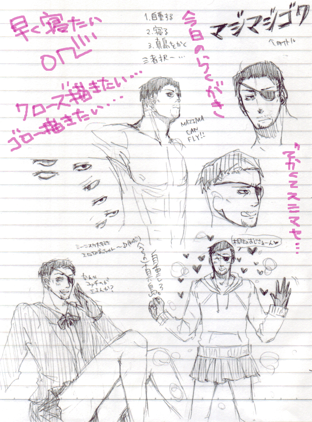 いろいろ切羽詰って精神的にガタがきてるとちょっとしたことでキレ易くなりますよね。 よりにもよって何でナリタのチャートだけ発掘されるんだい。 正直一番どうでもいいよナリタ。僕はそんなに愛されているのかいナリタ。 残りの買わなあかんかなぁ…。もったないなぁ…。きっとどっかに埋まっとるだけなんやで。 さて。 日々のアクセス数の増減を見てえらいチキンなのかもしれへんのやけど一喜一憂してます。 でも毎日誰かが来てくれてはるっちゅうだけで、拍手がゼロやなかったっちゅうだけで、ホンマに救われる思いですわ。 こんなとこで申し訳ないです。もっと精進したい思うてはります。 まだまだいろいろ足りてないぴよぴよサイトですが、これからも宜しゅう頼んます…!! もうそろそろサッムイけぇど、付きおうてや☆(笑顔) …方言混じるとどうもこう、誠実さというかいまいち感謝の心が素直に出ていない気がするのですが、(笑) 本当に来てくださる方、拍手してくださる方ありがとうございます…!! いつもあんまり感謝の言葉書いてなかったんですけど、実は陰でかなり喜んでおります。(笑) 陰湿でごめんなさい…。最近いろんなことにチキン過ぎて逆にふてぶてしくなってきています。あ…自己嫌悪が…。 今日もいくつからくがきしたんですがやっぱりいつも以上にクオリティが…。 本当どっちがいいでしょうかね…?らくがき増やすかちゃんとしたの増やすか…。 とりあえず数を描いて技術の向上を図りたいとも思うんですが、やっぱり試行錯誤して自分が現段階で描けるレベルの上限をちょっとづつでも伸ばしていくことも大切だと思うんだなぁ…。 ふむ。とりあえず欲望のままに頑張ります。(結論はそれか) 私事 展示絵が合格したという何というサプライズ。 まぁ、思い返してみると結構長い間頑張ってたと思うから、(もっと頑張れたはずだけど) それが認められたということでしょうか。うん。まぁ。よかった。 というか認められなかったら私といえども正直悲しい。 でもあんなの出すのはやっぱり恥ずかしいなぁ…。そもそも鳩入れる場所から間違ったよ。 とりあえず来年は絶対アクリルにするぞ。もう油なんてやるもんか。やるもんか。触りたくもない。 さっきまた更新しました。 日に何度も更新とかよっぽど暇に思われるかもしれませんが実は心の中は焦燥で一杯です。 ぼすけて。 チャート今からやるぞb いろいろ更新してみました。 お暇でしたら投票してやってみてください。(土下座) 今日も潜みたいけどチャートやらないとヤバイかなぁ…。 でも兄さん殴りたいなぁ…(ぇ こーの支配からの、卒業…!!! 解放されました。え?月曜日?だから実力と(ry 今日はクローズ描きたいな描きたいな練習したいな…。 でもまだちょっと疲れが抜けてなくて眠いです…。 マサカズ氏の髭ハァハァ どうしようこのアホゥ本格的に髭にはまってきた…! ミスチルのシングル聞きながら描きたいけどクローズにあの歌はちょっとどうなんだこれww うは。 今寝てたんだがすごい鬱な夢見た。 私生活の夢鬱すぎる…orz バスで寝過ごして目的の場所を通り過ぎたんだけど、前の画面に知らないバス停の名前が表示されてて凄く怖かった…。なんかひらがなの部分がカタカナとかそれどんな昭和…。 そのせいで展示絵を進めようとしてたのに時間がないことに気づいて焦ったり、焦ったら鞄の中のものが床に散乱して危うく鍵とか忘れそうになって怖くなったり、一緒に乗ってたはずの正彦さんが起こしてくれなかったり(笑)なんだか疲れる夢でした。 しかも何とか着いたら着いたで先輩と絵の色調が激似でへこんだり、なんか知らない人が手直しをし始めたり…。 夢って何があるかわからないから怖い…。 しかも普段あんまり夢を見た記憶がないから久しぶりにリアルに覚えてると余計怖い…。 でもまさか展示絵の夢を見るとは思わなんだ…。 そんなに怖いか私…。 とりあえず鬱すぎるけどクローズのラミカが作りたくてたまらなくなりました。(しめくくり) かなたん怖いよかなたんwwww でも指名される寸前に本能で目覚めて答えた私は結構凄いと思う。 今日は自重して早く帰ってきました。 本当にそろそろしっかり寝て風邪を治さないとやばいぞ。咳が止まらないとしんどいというよりめんどくさい。 とりあえず早く寝ることを前提にらくがきしたいと思います…! もういいや。いっぱいいっぱいでもとりあえず土曜日まで頑張れればいいや…。 土曜日になれば全てが終わるのです。 あれ?月曜日にもなんかあったっけ? 君たち、実力と名の付くものを実力でこなさずにどうするのだね。 もう私は頑張っても意味が無いような気がするから頑張らないことにするよb でも頑張らないとお金がorzorzorz ていうかこれから年末にかけての用事の多さに鬱orzorzorz もう搬入とか搬出とか業者はやってくれないのか何故私が動かなければならないのだね(何様) 今日はとりあえずこれで全てを悟ってくださいorzorz さっ