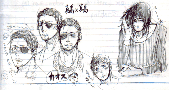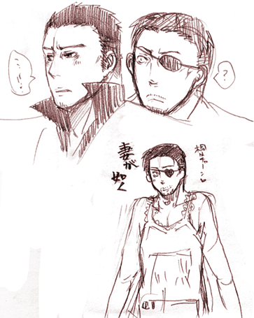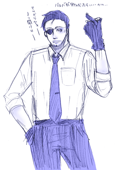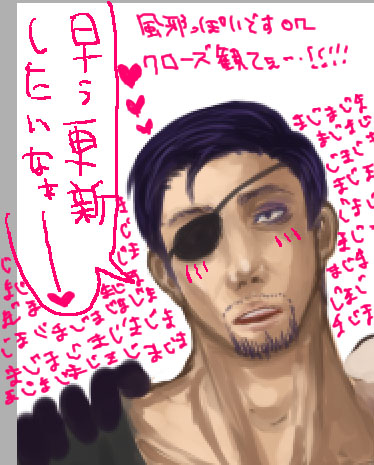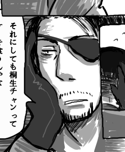 ロッテの季節限定洋酒入りチョコレート食べてます。うまうま。 結局今日はやろうとしたことを全てすっぽかしてお絵かきしてました(土下座) だって忙しいんだもんね!仕方ないよね!(滅べ) それとも今日ちょっと頑張って進めようかなぁ…。でも眠い…。 頑張れたら頑張っていろいろいじりたい… とりあえず昨日ゲットした「オヤジカタログ」と「Babyヒゲ特集」でむはむはしてます。 でもどっちかというとオヤジカタログのほうが萌えた。まだBabyパラ見しかしてないけど。 なんちゅうかこう、こう、オヤジ受がごっつう好きみたいこの子。 51歳の照れ屋なおじさんに萌えたり昨日の髭の関西弁オヤジに萌えたりBassoさんの別P.N.のやつに萌えたりツンデレ兄ちゃんのメガネを踏み割ってやりたくなったりもうふにゃふにゃですがうはうはです。(ようわからん) あぁー萌えるなぁー。おやじ。オヤジ。親父。(魔法の呪文) もっとそっち系のアンソロとかヒゲ写真集とか欲しいけど金が無いという…。 AAA2007も行きたいし冬コミも行きたいしポルノのライブも行きたいし今月末はポルノのDVDやらミスチルのCDやら発売されるから正直ホンマに金が無い。 バイトしたいけど時間あらへんしなぁ…。プライベートタイムを削って夜中にバイトなんてしとうないしな…。 仁墓も早よう欲しいしなぁー。なんか陸夫に会いとうてしゃぁないわ…。 そういえばCKBの「殺したいほど好き」という曲ごっつう好きなんですが、 これタイトルだけみると真→桐やけど歌詞は結構真←桐的なんですよ。 でもこの曲を仁墓の陸夫と智恵子に当て嵌めると凄い…! なんかめちゃくちゃぴったりで本当この組み合わせのための曲なんじゃないかと思うくらい素敵です…!! 最初仁墓観た時は何で智恵子はこんな男についていくんやろ思うとったんですが、今思い返してみると陸夫結構智恵子愛してたよね…!あぁ!!観たい!!! なんか久しぶりにポルノ聴いたら癒されましたー。 最近CKBしか聴いてへんかったからなぁ…。 そして聴く曲すべてが真桐真ソングに聴こえるという痛い典型的症状発生☆ むしろ好きな曲全てで真桐真妄想したいとかそんな感じです。 兄さんって「アゲハ蝶」だよねとかそういう…あぁ…描きたい…。 今日はちょっとだけらくがきできた…。カオス…。 真島×真島…!!!なんというパラダイス…!!!! 劇場版×原作を激しくプッシュしたい(五朗様総攻派) こんな漫画もどきを描いてます… 誰か漫画の描き方を教えてくださいorzorz コマ割とか何アレわかりません>< あぁー… 今日はいろいろ書きたいこととかあったのですがいかんせん慢性化してきた睡眠不足で眠いのでそろそろ本読みながら寝ますorz とりあえず今描いてるやつ明後日くらいには仕上げたいなぁ… 線画はほとんどできたんで後は色塗りか…そんなに細かく塗らない予定なのでたぶん大丈夫でしょう… そういえばリンク追加したいといいつつできなかったorz 明日…ええ明日… なんかやることが沢山だ… 明日はちょっと暇かと思ったら案外暇じゃないことに気づいた…。明日もらくがきできないかなぁ…ツマラナス… シャー芯もきれてた… 0.3ってなかなか売ってなくて困りますよね。私は文を書くにも絵を描くにも基本0.3の2Bなので、売ってないし高いし不便です。 でも一度使うとやっぱり0.5には戻れない… 購入したアンソロ途中までしか読んでないんですがちょっとなんとも素敵なサプライズがあって萌えました…!! 兄さんっぽい髭の…髭の関西弁オヤジ…!!しかもカワユス…!!!! …萌えた話については明日書きとめよう。 とりあえず私はヲトメな受オヤジが大好きみたいです。 なんかもう、若い子には戻れない気がする…。 逃げる度に私はなんと欲望に忠実で易きに流される人間なのかと絶望に近い感情に支配されます。 だがまあ今日は予約したフィギュアを取りに久しぶりに行ったメイトでオヤジアンソロと髭アンソロを買い手持ちがない故に結局フィギュアを買ってこなかったという醜態を晒しつつも久しぶりに本を買って楽しめそうなので良い。 なんだか髭好きになりつつある辺りこのアホゥどないしよか… 今日は朝からネ申降臨で大変でした☆★ なんだか一日中ゴローを描いていたような気がする… さて。本日のらくがきたちも気に入ったやつはそのうちちゃんと描こうと思います。 あぁ…ハロウィン絵とか描きたいな…31日の間だけtopに置いとくとか…(誰も見ねぇよ 寝不足なのに頑張るから頭が痛くなってきました。自業自得です。 今日一日ネ申降臨したりして元気だったのは朝リポビタンD飲んだからかもしれません。 本当は五朗様オススメのゼナが飲みたかったけどコンビニになかった…orz ではでは。らくがきはゴローワールドへ。↓ だってほら、人前でニヤニヤするわけにはいかないじゃないですか(ぉ もし公衆の面前でネ申降臨してニヤけそうになったら唇の裏側とか舌とかを思いっきり噛むといいですよb 私はこの方法でいくつもの修羅場を乗り越えてきた…(