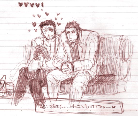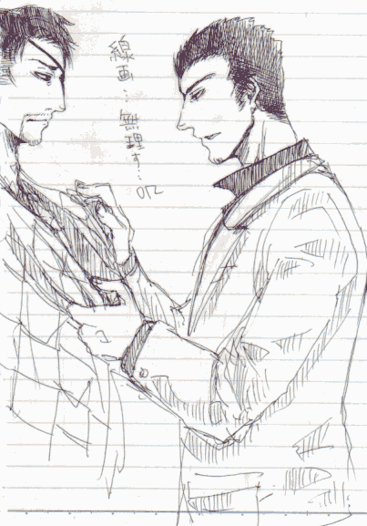 最近程好く頭が痛いです。眼精疲労?寝不足? どうも今の私の睡眠時間の基準は4時間のようです。4時間切るとちょっとヤバイ。4時間半寝れればまあまあ。 こんな生活していて体を壊さないかと思うんですが、何故か私の体は丈夫なようで一向に体調不良は現れてくれません。これが若さってやつかな…。(遠い眼) わぁぁ…。ごめんなさい…非常にごめんなさい…。後はのっけたんの服と兄さんの刺青と背景…。 エプロンマジーは思ったよりキモくなりそうですにこにこ! とりあえずらくがきだけばばばb 友人に線すっごい綺麗な人が居ていいなぁという。 何か途中で面倒臭くなるんですよね…。つけペンでやればまだましになるかな…。 わんわんきりゅわん かわいいこって難しい 私だけの~ニーソ~♪ 何を血迷ったか。 明日はきっと下半身がカンガルーな真島描きます。(ネタ提供:はまちさん) 結局帰宅して飯食って気づいたらまたもや22時…!(30分しか寝れなかった…!) なのでなかなか絵が進みません…うぁー!!スミマセン…努力します…明日はもっと早く帰還できるはず…!! 今日は現実逃避なのかふと気がつくと右手が勝手にバニー真島を描いてました。重症のようです。 そういえば「女装30題」とかやってみたいです。兄さんときりゅたんで!!ダブルで!! あー。そろそろちゃんと寝ておかないと明日が辛いので寝ます…。脚の筋肉痛が…!何でこんなに…。 わお…!!何かちょっと、桐真優勢…!?投票有難うございます!! 拍手レスです! 11/29の方 コメント有難うございますー!! わぁぁ…!そんな好きだなんて言って頂けたら私調子に乗ってまたやりますよ…!!(自重) 有難うございます…!本当にあんなキワドイものにコメント下さる方々がいらっしゃって良かったです。(笑) あんな兄さんに惚れたら危険ですよ…!火傷じゃ済まないですよ…!公然わいせつ罪で一緒に逮捕される覚悟が必要ですよ…!!(笑) ではでは拍手有難うございましたー! やったったーやったったー♪ PS3 60GBモデル 落札 (by ヤフオク) 西遊記DVD限定版 購入 (by amazon) そのうえ クローズZERO DVD 最凶エディション も予約する気満々です。 金は…あるのか私…!!!! お金が欲しい!バイトがしたい!でも働きたくない!ていうか時間が無い! 色々頑張ろうと思いますbbb 久々にアマゾン見てたら欲しいものが多すぎて困る…!ホモーホモー!!(こら) 「さよならを言う気は無い」の続編めちゃ欲しいです。ヘタレ探偵×ツンデレヤクザのお話なんですが、受の天海の俺様具合が良いです。年下で美形っていうのが玉にキズだけど!!(そこはマイナスポイント) 最後までなかなか二人がくっつかないので読んでいるほうは散々じらされて歯痒くなるのです。プラトニックからEROに移行する瞬間が好き…! でも絵は前の人のが良かったな…可愛くて…。 今日はぐちゃぐちゃした文章をちびちびちびちびしたためていたのでらくがきができひんでした…。 ていうか最近スランプっぽい…。 僕…負けない…!! 機会があったらまた文章も頑張って書いて載せていきたいなぁと思うんですが、いかんせんやっぱり文章書けへんのですね…。 もっと表現力を身につけたい…!ていうか台詞と感情表現があまりに少ない…!情景描写ばっかり…orzorz まぁ、もともと書いたものが内臓ファックだっていうことで既に色々問題があるとは思うのですが。 攻がいつでも受を殺しそうな全く愛の無い話が読みたい…寧ろ書きたい…。 愛してるけどつい乱暴な態度とっちゃうとかじゃなくて、もともと全く愛が無いみたいな。 でも受はぞっこんという…。 基本的には気の無い素振りをしつつ実は愛してる的なシチュエーションが好きなんですが、敢えてそういったものに興味を抱いてしまいます。色々なものからちょっとズレたのが好き。 ああー手が冷える…。手が冷えると上手く作業できないのでいろんなやる気がなくなります…。 結局今日も帰ってきて飯食って寝て起きたら22時でオークションやって予約してたら真島描く時間が…orzorzorz 頑張ります。お休み欲しい…。誰かインフル移してくれ…。 サイトも改装したいです(飽き性)。ブルーベリーソースの掛かったヨーグルトみたいにしたい!(なにそれ) わぁぁ…!!!また拍手が沢山…!!!有難うございます!!頑張ります!!!! でも今更ながらにやはりあんなんで申し訳無いです…。次は普通のに…なる…かな…?(確立低め) 拍手レスです! 朝霧様 いえいえ…!!急かしてしまったのでしたらこちらこそスミマセン…!! …そ…そのリクエストは…!!!!! り…了解しました…!!!(はぁはぁ) 出来るだけ早めに頑張ります…!!あぁ!動悸が止まりませんはぁはぁ…!!(ぇ) リクエスト有難うございました!! 新しいやつ食べたい…コレ…コレくれッ!!(by唯) わぁぁ結局今週末もグダグダでした…。駄目だ…やっぱり私が一番集中できるのってせいぜい22時~24時の二時間程度みたいです。 なんだか…たまーに緊張性頭痛が…。偏頭痛ではないんですよね。ごくたまに偏頭痛っぽいのもくるんですが。 わああー!キ