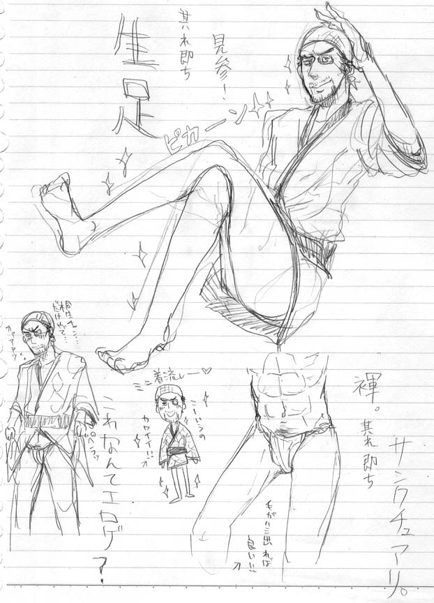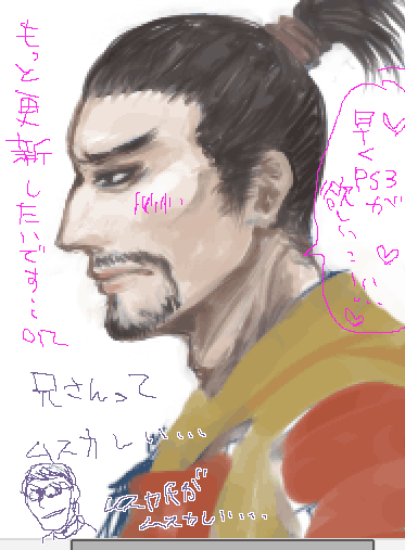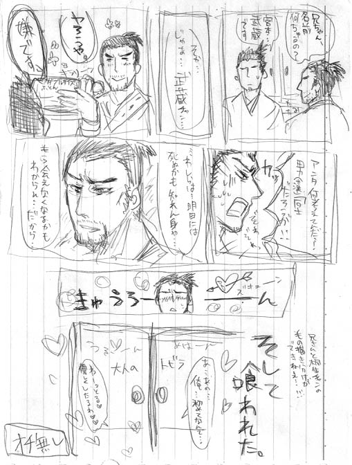 とりあえずトップだけ更新。 今日リンクの整理もしたいけど…無理かな…orz(張りたいサイト様が多すぎる…!!) とりあえず拍手絵のネタがもわもわっときたので描こうと思います。 あでもやっぱり拍手は一枚絵よりシリーズとか続きもののほうが楽しいかな…。 明日も早起きして色々片付けにゃならんので結局今日も3時間…。 なんか平日少ない分週末にまとめ寝してるみたいです。でもそのせいで寝過ごして一日が終わるという…。やっぱりお休みは二日欲しい…。明日休みTeeeeeeeee!! 金曜日は沢山金を使ったけれども、全て予約やら振り込みやらで現物が手元に来ないので何だか買い物のストレス解消感が無いです。早く諸々よ届け!! メイトで羊CDも予約してきました ![]() 早よ欲しい…きるーたんに羊数えてもらいながら寝たい…!はぁはぁ…!! 毎日通るところにメイトさんがあるんですが正直デスノグッズくらいしか見るものがないです。最近デスノ熱も冷めてきた。元々原作ファンだしね。(でも映画前売り券をローソン特典付きで予約した笑) でもこの前オヤジアンソロやらヒゲアンソロやら買ったのでやっぱりメイトさん好きです。せめてもうちょっと原作グッズ置いてくれたらなぁ…。 そう言えばメイトさんで思い出したんですがずっと書こうと思って暇がなかった。 前にあるサイト様の日記で読んだんですが…。 龍如、兄メカの噂…!(がしょーんがしょーん) と…とっても気になります…! もし万が一そうなったら、メイトさんでも何かグッズ取り扱うんでしょうね…! 正直私は愛するものに関するなら全てに同等の愛を注いでしまうタイプなので、こんな感じ↓。 わしゃあ…嬉しゅうて堪らんのや…。 龍如に直接金が注ぎ込める…。 本物の、グッズ使うた主張ができる…。 なぁ…もう焦らすなや… 瀬賀様…! 気になるなぁ…。 あれです。中の人が全員そのままなら声だけで萌える自信があります。(黒田様…!) ああもう何でも良いから兄さんが見たい!!兄さん兄さん兄さん!!!(狂った) ていうことでお休みなさい!布団の中は手が冷えなくて良い…! 結局 やろうとしていたことを なにひとつ出来ずに終わった日曜日。 もう…われホンマにいんでまえ…orzorzorzorz 12時間近く寝てグダグダして沿志奏逢2とapfes'07DVDを買ってPS3を買おうとして60GBモデル在庫切れでがっかりして終わりました。 それはそうと何だこの胃部不快感。空腹時の悪心に似てる。 あとは…龍如ネイルチップ作って終わった。何とも中途半端な出来…。白のネイルチップ買って来た方が良かったな…。 PS3…ネットで買えるかな…。 そういえば龍如の特設スペースを発見して流れてるプロモをさり気無く凝視して映し出された兄さんのキモさに圧倒されつつ萌え萌えしてきました。はぁはぁ。やっぱり良いはぁはぁ。 な…何だかもっと書く事あるんですが胃部不快感のせいで上手く書けそうに無いので寝ます。うわなんだこれ。別にお腹減ってるわけでも無いのに…。あぁ…気持ち悪い…。 拍手有難うございます…!レスは…明日…!! 今日は…。 今日は何だか久しぶりに集中して真島を描いた…。 そんな訳で、アレやコレやな真島やらその他が仰山居てはりますので、是非ともお気をつけて御覧になっておくんなはれ。 …皆様が引かないことを祈って。 じかんがたりない…! はったんそんなに描きにくい訳じゃないけど、まだいまいち特徴を掴みきれてないような…。 ていうかのっけたんとのモミアゲとか髪の毛とか眉毛とかの描き分けがムスカしいような…。 刈り上げが懐かしい…!! 見参やる前にもう一回龍如プレイしたいです。兄さーん!兄さーん!! ちょっと黒田氏萌が激しい…。 本当メサイア欲しくなってきた。アマアマ…。 龍如とメサイア交互にやったらアレ死ねそうな気がします。メサイアの黒田氏ヴォイスを聴きながら龍如をプレイ…!うわうわ鼻水出そう!やってみたい…! 今週末いろいろ溜まったアレとかナニとかを解消したいです。ネサフも出来て無いんですが…!うわーん…!! そういえば今日友人に、絞殺って萌えるよねとまた理不尽な話題を吹っかけました。 でも良いと思うんだ…!道具じゃなくてそれこそ自分の「手」で殺す訳だから…! 殺される側もどぉーんってなって痛くて終わりじゃなくて、じわじわ苦しくなって頭が膨張するようなぼわぼわした感覚になって、そんできっと死ぬ間際には何か気持ち良くなるホルモンが分泌されるんですよはぁはぁ。 でも、チェーンソーで指先とか命に別状無さそうな所から少しずつ切り刻んでいくのも萌えます。輸血とかしながら生命維持に必要最低限な姿まで削ってみるとかね…! 餓死も好き…カニバリズムとか割と萌えられます。兄さんって内臓ファックとかやりそう…! ![]() はぁはぁ。変態な話題でゴメンナサイ。でも猟奇萌え☆ こういうエグくてえげつないものが大好きです。絵も小説も詩も、耽美なものより断然えげつなくてドロドロベトベトしてる生臭いものが好きです。 といいつつ最