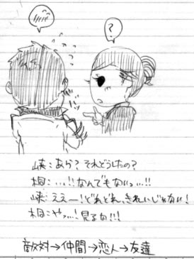 じぇんすっごい喋りたそうだったのに話振ってもらえなかった…!!!wwwww TVとかって大体ヴォーカルしか喋らせないですよねwww はるてぃもいつもちょっと喋りたそうなのにスルーされるwwww ていうかチルってソロパートでも目立ちませんねギター…!!www田原様協調し過ぎだよwwww とりあえずサクスマイルに悩殺されますたvvvvvv Ah~サクサクの唄~さぁサクサクサク~またどこかでサクサク~とりあえずサクサク~!!!(これも愛) 桑さんの革手袋!!!!!!!うぉぉぉぉっぉぉぉカコヨス!!!!!!!!!!!!!!! 私基本的に狭山はどうも好きになれないんですが こういう関係なら全然大丈夫なことに気が付きました。 兄さんとの恋に悩む桐生チャンの良き恋愛アドバイザー狭山。 狭山は狭山でまた別の恋を見つけてくれればみんなが幸せになれるよ。 だってほら、まだ若いんですから。 さて、とりあえず有言実行で更新しました。 明日くらいには五朗様描きたいのです。ああ。描きたいのに描けないジレンマ。 本当は今からでも描きたいのですが、最近あまりに睡眠不足なので今日は自重します。 だって…ここ一週間くらいずっと平均3~4時間しか寝てないよ…。 でもほら、やっぱり寝る間を惜しんででもやりたいことってありませんか。 時間は有効活用しないといくら人生長いといっても足りませんよね。 最近CKBしか聴いてません…! でもいいですよね。あのノリやっぱり凄い好きです。中毒性があるって本当だ。 刺したなる→ベクトルを自分へ→解決☆\(^0^)/ 最近自分が真性Sなのか真性MなのかなんちゃってSなのかなんちゃってMなのか判らないです。 いや、だが変態なのは確かだ。(ぉ 今日は一時間に一枚のペースで効率的に拍手真島をらくがきしてましたww けれどやっぱりらくがきだからバランス取れない…。 五朗様を描こうと思ってたのですがすっげ描けなくてベコベコです。ぐすん…。 私3次元描くときも殆ど公式とか見ないのです。だって凹むから…! でもさすがに一回は模写しないと頭に入らないか…。一応あきっともはるてぃもさっくんも一度はちゃんと描いたことあるんですよ。 ううむ…龍如とポルとチルにベクトルが分裂してどれも中途半端…!! とりあえず今日は拍手絵描きます。 最近すっげ思うんですが、私どうも色彩センスががっつり無いんですよね…。(全てのセンスにおいて欠落してるけどな!) 真面目絵もイラストも何描いても固有色っていうかそのものの自然の色でしか塗れないという…。 本当に格好いい色使いとか出来る方マジーで尊敬ですよ…。そして凹む…。 ああ。今日も朝晩二回鬱のダブルヘッダーだったのできっと変な文章です。でも私…負けないッッ!! おいおいおい。 私生活が鬱過ぎてやっぱりヤヴァイです。 お前そんなこと言ってると流行のニュースよろしく心臓まで包丁刺しちまうぞコノヤロー。 芸能のほうモバイルサイトにしようか悩み中です。 パソコン持ってて携帯持ってないユーザーは殆ど居ないと思うけど、携帯持ってるけどパソコン持ってないっていうユーザーは居てますよね。 でもモバイルだとでっかい画像載せられないしデザインもあんまり弄れないからどうしようかなぁ…。 両方作るのはめんどいもんなぁ…。ううむ。 ああん。やめぇやホンマに。刺したなるやん。 土下座でホームランが打てそうです。土下座の極み!!(かきーん!ホームランやぁー!!) ね…眠たい…!とりあえず色と背景だけごってごてにしました。悪趣味万歳!! 目に痛い配色でスミマセンです…。 あーッ!TOPも変えたいし拍手絵も変えたいしリンクも張りたいし芸能サイトも作りたいのにッ!! とりあえず自分メモ TOP AAA五朗様3変化くらいランダム(GORO No.5、ゴロXILE、五朗流裾はin) 拍手 M4K2、原真1、原真2、劇真、見真 ランダム 最近はちっちゃくてぷにっとしてて思わず抱きしめたくなるようなめんこい兄さんから 漢らしくしかしエロセクスィーで誘い受けなのか襲い受けなのかはたまた攻なのか曖昧なくらい格好良い兄さんまで何でもイけます。 もうきっと真島なら何でもいいんだね!! 兄さんを嫌いになれない自信があります。多分いつか熱は冷めるんだろうけどでも嫌いにはならないなぁ。 ヘタレな兄さんから凶暴乱暴な兄さんから淫乱な兄さんから優しく暖かい兄さんまで、本当真島ってだけで愛せます。(笑顔) ああー!いろんな兄さん描きたいのに最近描けない…! なんだか見てて嫌になるというのはこれスランプですかね。 だったらまたここからちょっとでも上昇しないかなぁ…。 …ふっかーつ(劇真風)しました! 多分私の周りの普通の人にとって本当の修羅場はこれからだと思うんですが私にとってあんなもの修羅場でもなんとも無いのですげへげへ。 今日は来てくれはった方、見てくれはった方、買うてくれはった方、スケブ頼んでくれはった方、ペーパー貰うてくれはった方、話しかけてくれはった方、そんでお友達はん、 ホンマに有難うございました!!! いやー!ていうかあんな龍如好きさんとポル好きさんが居てはると